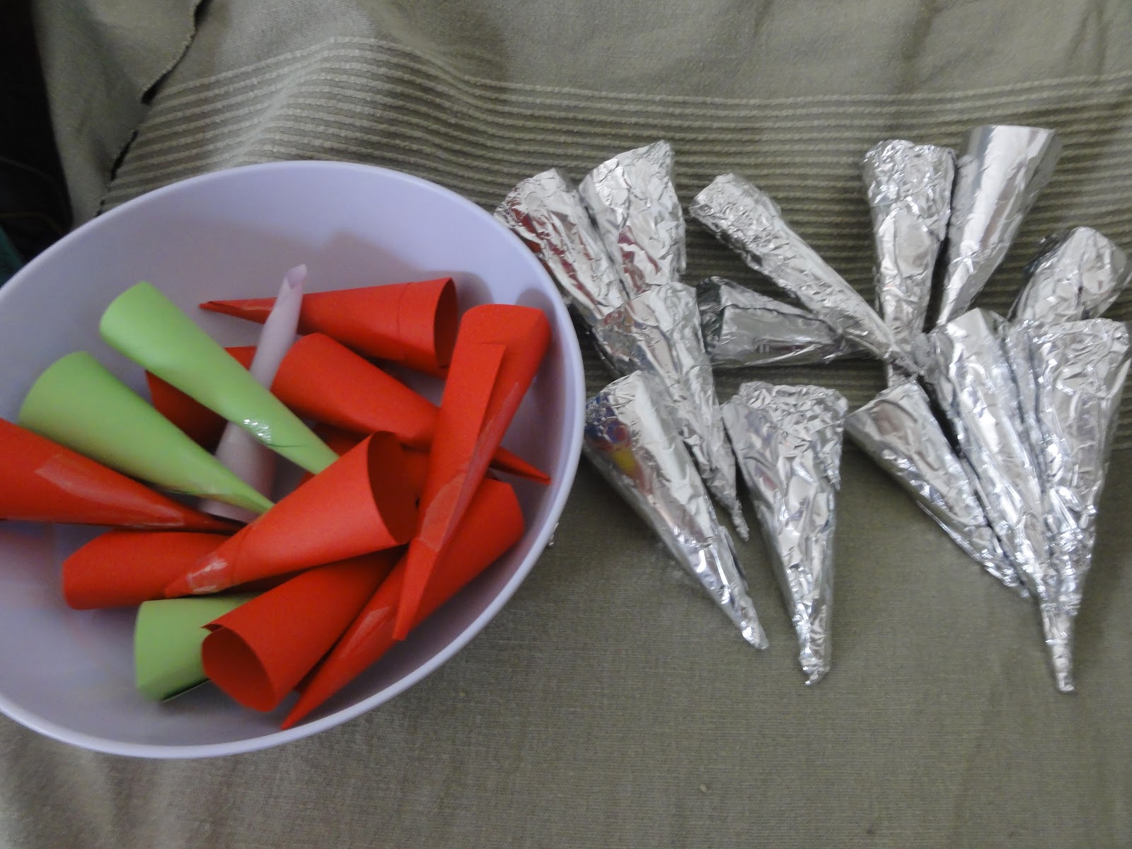 ...επειδή δεν ήθελα να αγοράσω μεταλλικά χωνάκια για τα κορνέ, πήρα χαρτόνι και τα έκανα χωνάκια και τα έντυσα με αλουμινόχαρτο